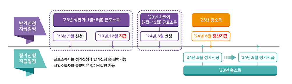 - 상반기 지급일: 전년도 상반기 (1월~6월) 소득에 대해서는 당해년도 9월 1일~15일까지 신청하며, 지급 시기는 당해년도 12월 말입니다.