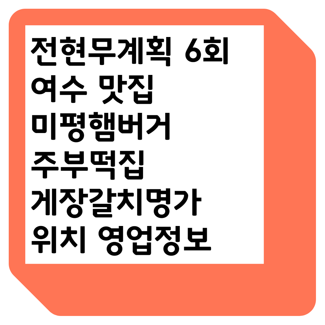 전현무계획 6회 전현무 곽튜브 와 김병현 고은아와 함께 여수의 맛집들을 방문합니다. 6회에서 소개되었던 햄버거, 떡, 갈치 가게들의 위치와 주소 메뉴들을 알려드리겠습니다.
