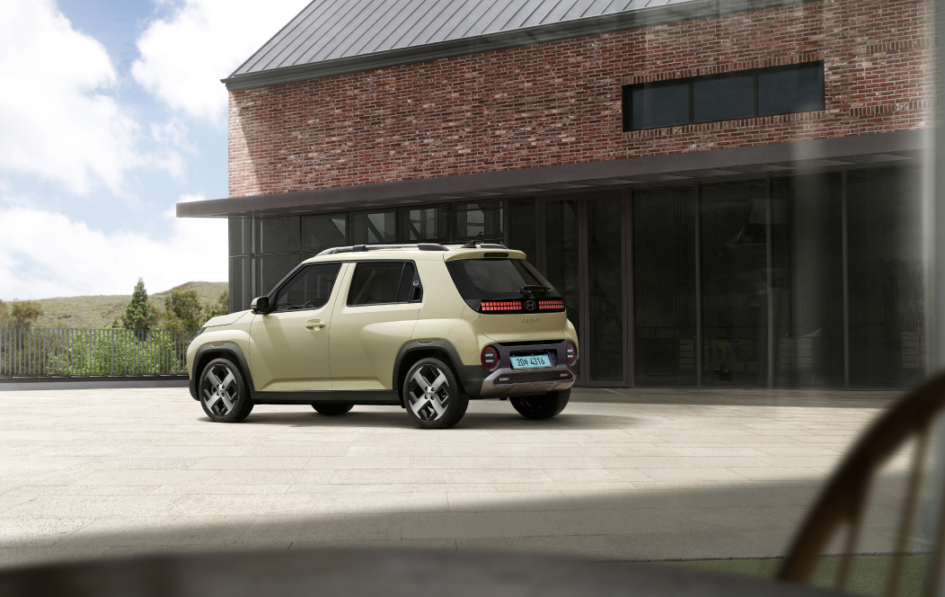 전면 그릴은 서킷보드 스타일의 블랙 그릴이 적용되어 헤드램프, 충전도어, 프론트 카메라를 포함하고 있어 첨단 기술력을 강조합니다. 측면부의 휠 디자인은 픽셀을 형상화하여 강인한 바디와 조화를 이루며, 리어 도어 핸들부에 새겨진 독특한 로봇 표정의 뱃지가 눈길을 끕니다. 후면부 또한 픽셀 디자인이 적용된 리어램프가 전면부와 통일감을 이루며, 간결하면서도 대담한 면처리가 캐스퍼 일렉트릭의 미래지향적인 이미지를 완성합니다.