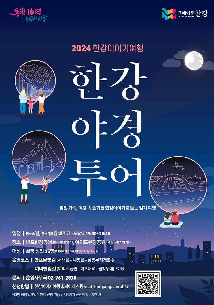 2024 한강야경투어는 전문 한강 해설사와 함께 걸으며 한강의 숨겨진 문화와 도심에 얽힌 이야기를 듣는 휴식형 투어 프로그램으로써 5월 10일부터 6월 28일까지 운영합니다.