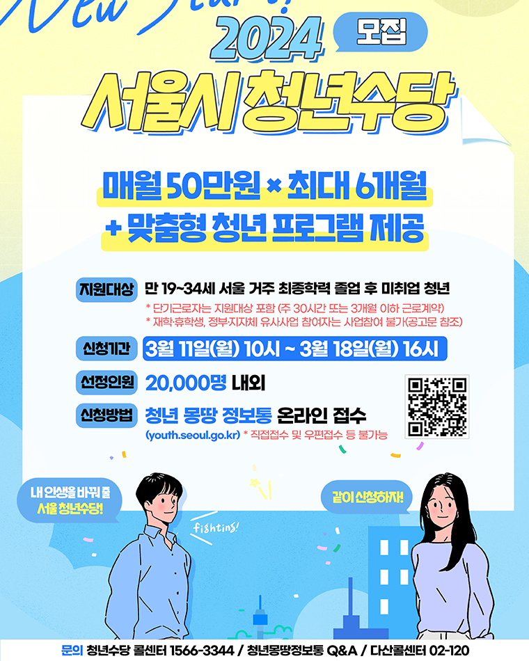 서울시는 월50만원씩 최대 6개월간 지원금을 지급하는 '2024년 서울 청년수당' 참여자 2만 명을 3월 11일 오전 10시부터 18일 오후 4시까지 모집합니다. 신청 방법 과 조건은 어떤것들이 있는지 한번 알아볼까요?