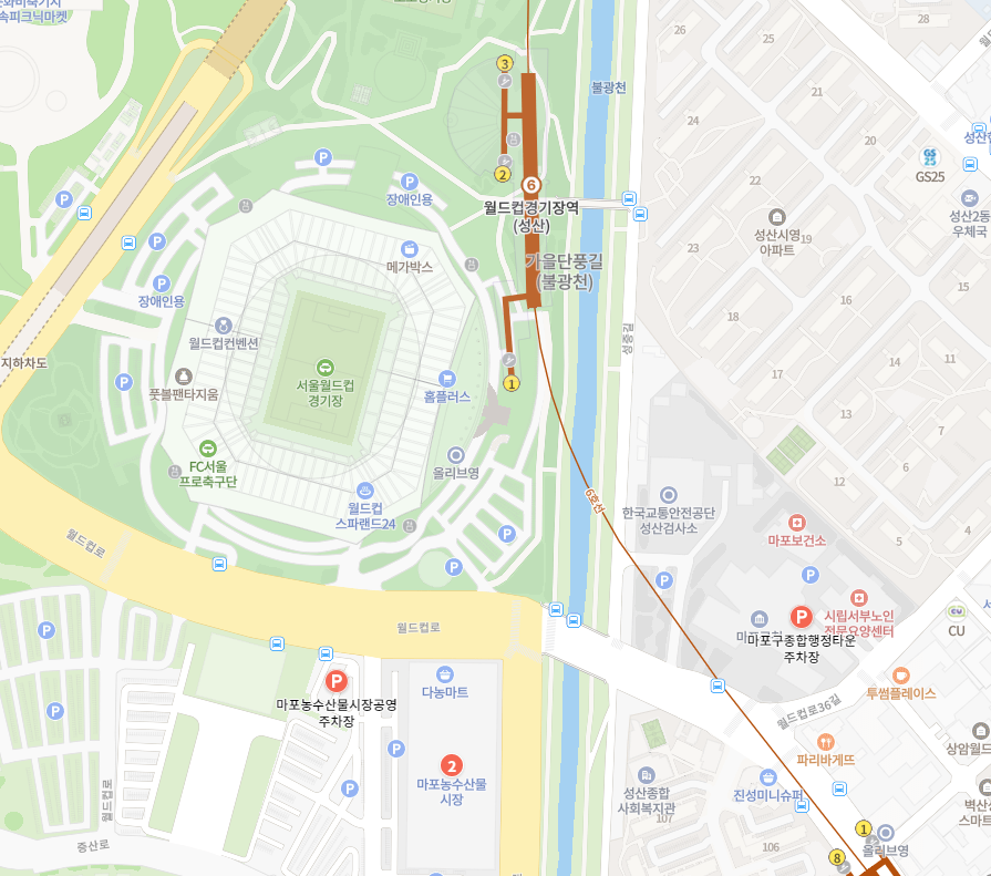 지하철 : 6호선 월드컵경기장 1번,2번 출구 이용