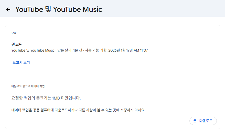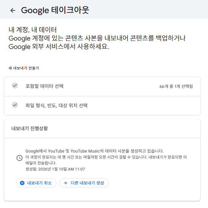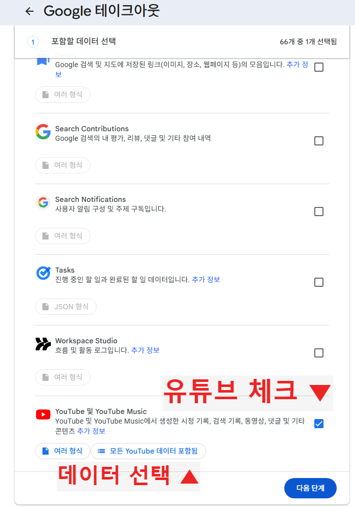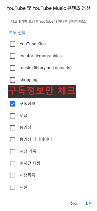 다른 데이터도 함께 받고 싶다면 원하는 항목(재생목록, 시청 기록, 좋아요 표시한 동영상 등)을 추가로 선택할 수 있습니다.