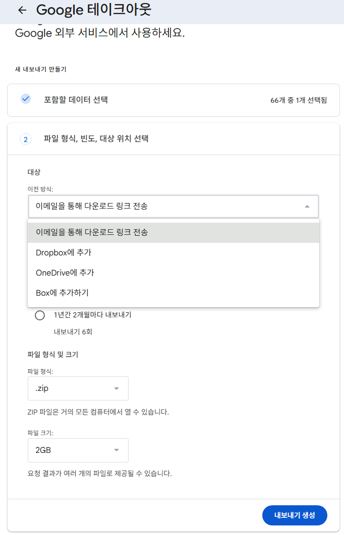 설정을 완료했다면 "내보내기 만들기" 버튼을 클릭합니다. 구글이 데이터를 준비하는 동안 기다려야 합니다. 데이터 양에 따라 몇 분에서 몇 시간까지 걸릴 수 있습니다.