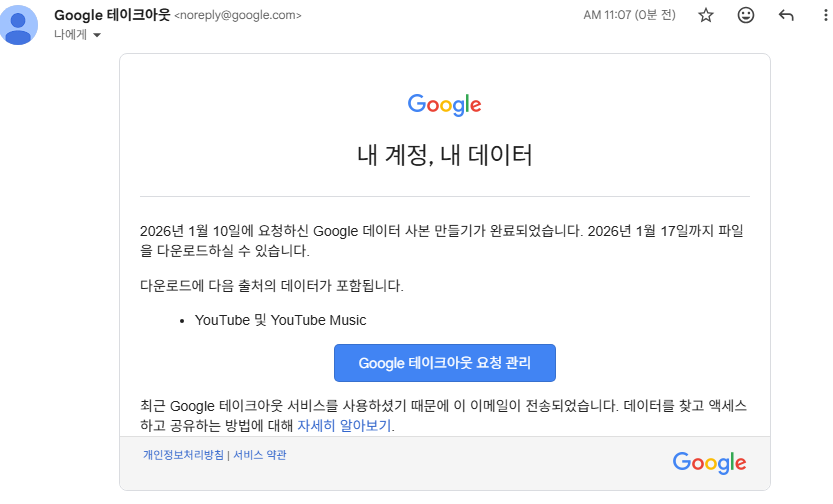 Google TakeOut은 구글이 제공하는 데이터 다운로드 서비스입니다. Gmail, Google 드라이브, 유튜브 등 구글 서비스에 저장된 내 데이터를 한 번에 받아볼 수 있습니다. GDPR(유럽 개인정보보호법)에 따라 사용자의 데이터 이동권을 보장하기 위해 만들어진 서비스입니다.
